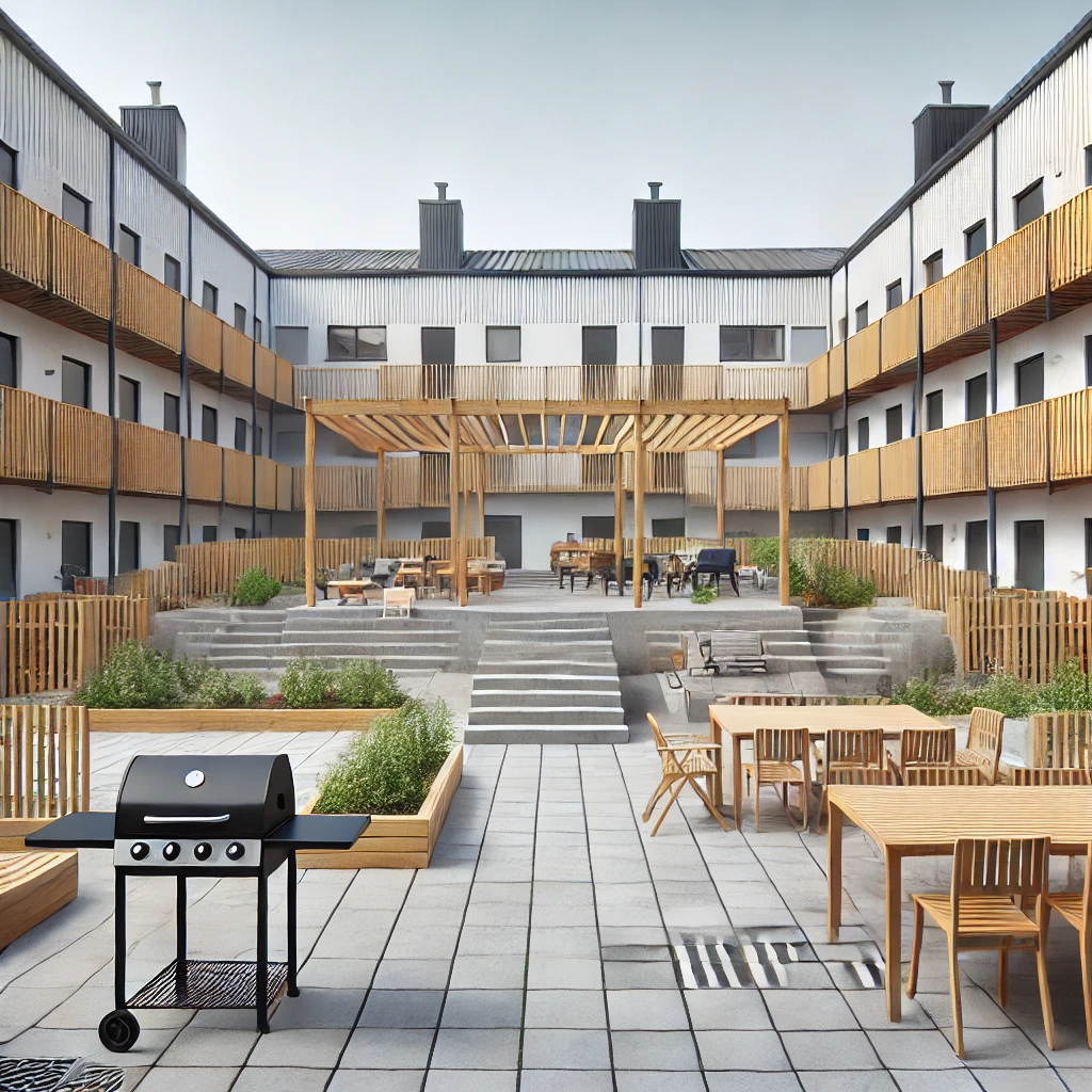 Ett annat projekt var att förvandla en trist innergård till en funktionell social yta med en grillplats, pergola och sittgrupper. Resultatet var en levande och välkomnande plats för sammankomster och fester.